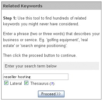 This is going to generate a list of 300 related terms. Click on each term to get more related terms for that particular term and on the right you can click on these to add to the Wordtracker basket. In my case for the example above and in the video a “Reseller Hosting” search also gave me “hosting” which when clicked gave me another list of 300 hosting terms. What I can to do here is have a quick look through to see if there are any original Core Terms that I might have missed, maybe some terms that we don’t target specifically at the moment but are related.