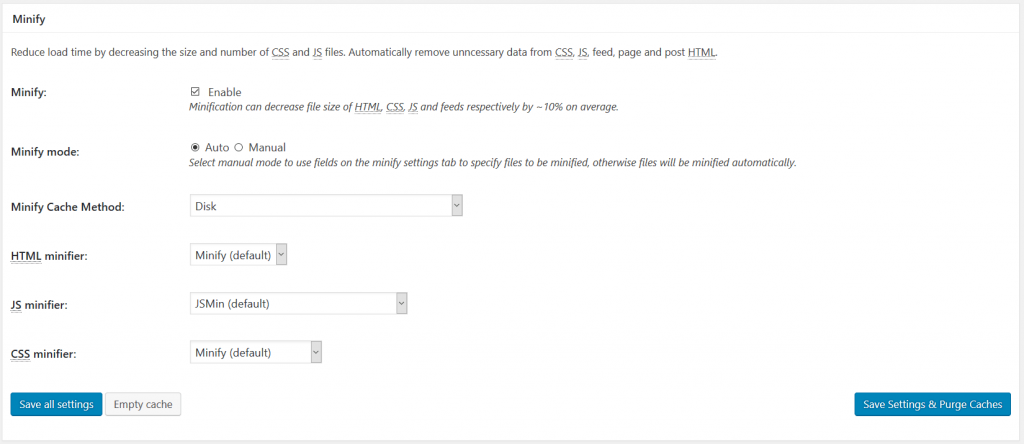 Minification compresses html, css and js files reducing the page size and therefore improves page load time. This is an incredibly important section and you need to pay attention and check your pages are functioning correctly after enabling. Enable this with the checkbox and Minify mode should be Auto and Minify Cache Method must be Disk. Do not use Memcache/Reddis for this as could be a lot slower on a shared hosting server. You can confirm this by enabling Minify and doing a Pingdom test. Again, check your pages are rendering correctly after activating Minification as some theme/plugin CSS and JS files might not react favorably. It works out the box for me but your mileage may vary.