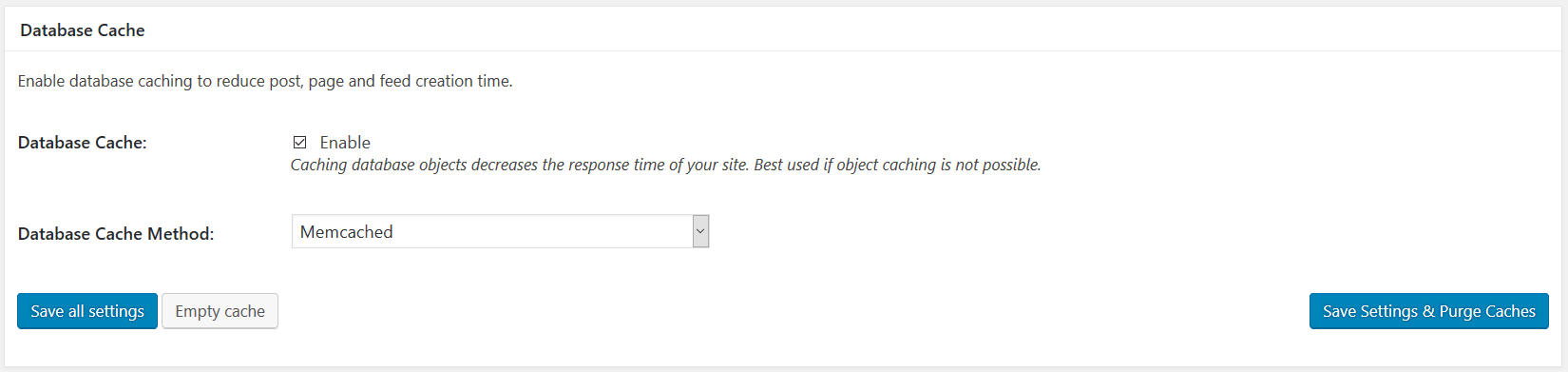 Enabling the Page Cache creates static versions of your WordPress pages to visitors rather than executing PHP scripts and queries. By default the Disk: Enhanced method will be enabled. In the drop-down you’ll also see Memcached and (possibly) Redis available. Reddis is another database caching engine we use but it’s not installed by default on all our servers. My advice to you is to go through them all. Enable Disk: Enhanced and then do a page speed test on Pingdom. On shared servers I would recommend you keep the Page Cache to Disk: Enhanced and save your memory overhead for database calls. On a dedicated server or VPS you’d want to test and compare but in an environment where you have SSDs and almost unlimited memory then the difference is negligible.